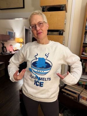 As part of the Soup & Bread community meal project I run, my friend Sheila and I created these cute “SOUP MELTS ICE” t-shirts as a fundraiser for the Illinois Coalition for Immigrant and Refugee Rights — a group that is doing the work. The online pop-up shop is open only through Sunday, February 8, so get your orders in now. Once they’re gone, they’re gone. Available as short- and long-sleeved tees as well as a crewneck sweatshirt, as modeled below.